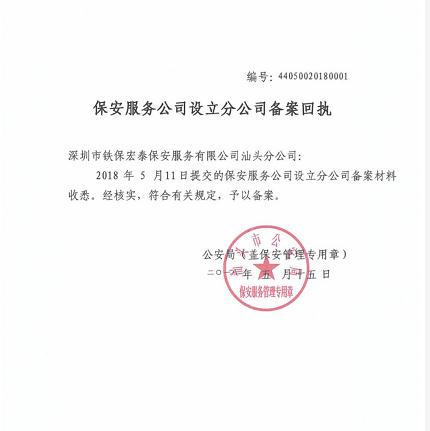 2018年5月11日提交的保安服務(wù)公司設(shè)立分公司備案材料收悉。經(jīng)核實(shí),符合有關(guān)規(guī)定,予以備案。