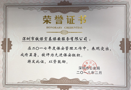 祝賀我司在2017年度保安管理工作中,表現(xiàn)突出,成績顯著,被深圳市公安局評(píng)為先進(jìn)保安組織。