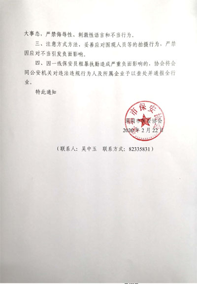 自抗擊新冠病毒疫情以來,根據(jù)省內(nèi)外媒體近期一些報道,個別保安員在防疫一線工作中存在不同程度的暴力值崗執(zhí)勤現(xiàn)象,嚴重損害了保安隊伍形象,同時在社會上造成嚴重的負面影響。為此,根據(jù)各級領(lǐng)導指示,協(xié)會有必要進一步規(guī)范防疫期間一線保安員崗位的執(zhí)勤紀律,避免防疫行動中出現(xiàn)背離法治、文明精神、社會公德的粗暴行為,以及這些行為所引發(fā)的不良社會影響?,F(xiàn)將保安員防疫文明值崗執(zhí)勤要求通知如下: