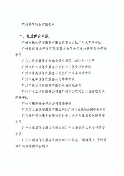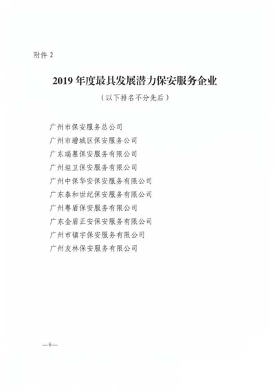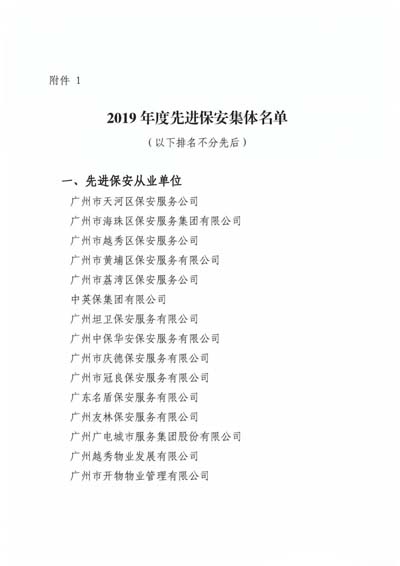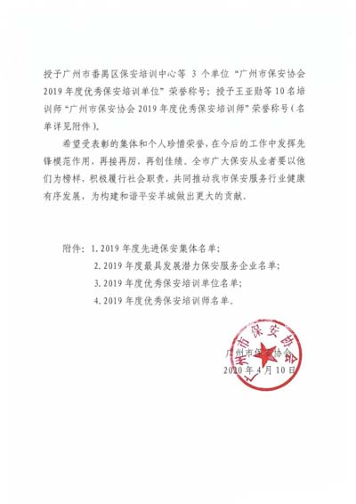 廣州市保安協(xié)會2019年度先進保安集體”榮譽稱號;授予廣州市保安服務(wù)總公司等10個單位“廣州市保安協(xié)會2019年度最具發(fā)展?jié)摿Ρ0卜?wù)企業(yè)”榮譽稱號;授予廣州市番禺區(qū)保安培訓(xùn)中心等3個單位“廣 州市保安協(xié)會2019年度優(yōu)秀保安培訓(xùn)單位”榮譽稱號;授予王亞勛等10名培訓(xùn)師“廣州市保安協(xié)會2019年度優(yōu)秀保安培訓(xùn)師”榮譽稱號(名單詳見下文)。